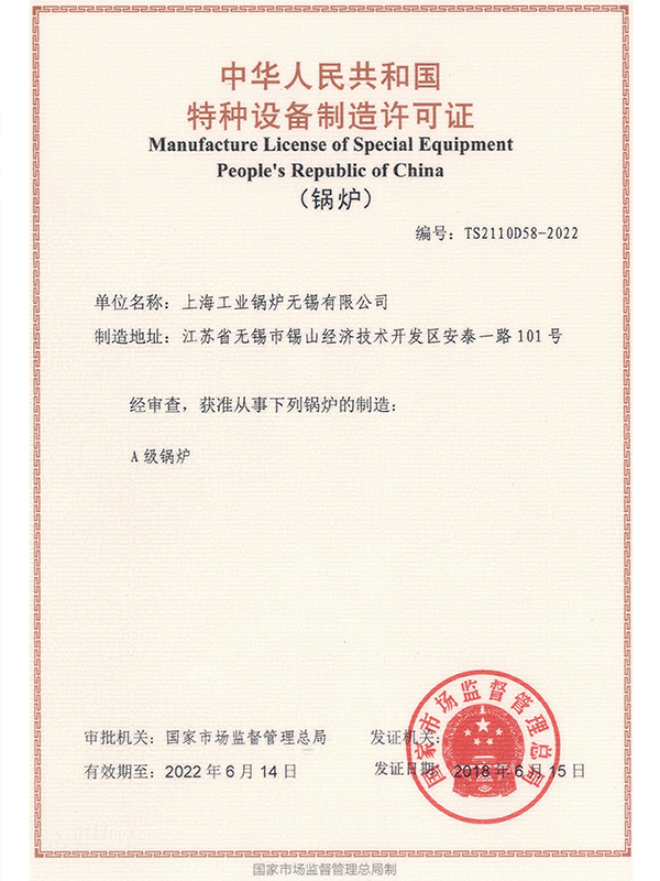 On June 15, 2018, the company obtained the highest level of Class A boiler manufacturing license for the special equipment manufacturing license of the People's Republic of China
